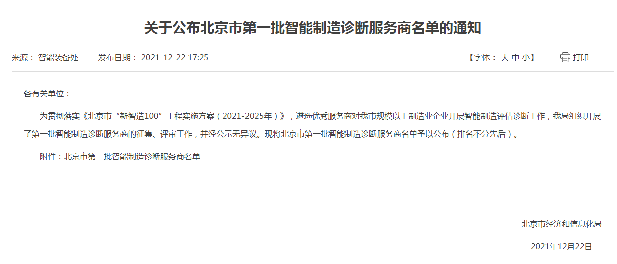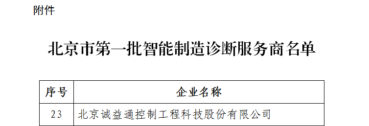 為貫徹落實《北京市“新智造100”工程實施方案(2021-2025)》,推動企業(yè)實施更大力度、更高層次的智能制造技術(shù)改造,遴選優(yōu)秀服務(wù)商對市規(guī)模以上制造業(yè)企業(yè)開展智能制造評估診斷工作,北京市經(jīng)濟(jì)和信息化局于今年9月組織開展了診斷服務(wù)商的征集、評審工作。根據(jù)2021年12月22日公布的評審結(jié)果,誠益通成功入選“北京市第一批智能制造診斷服務(wù)商”。