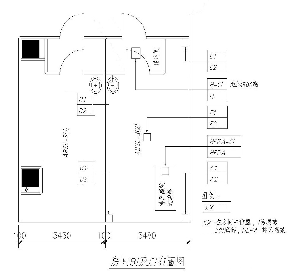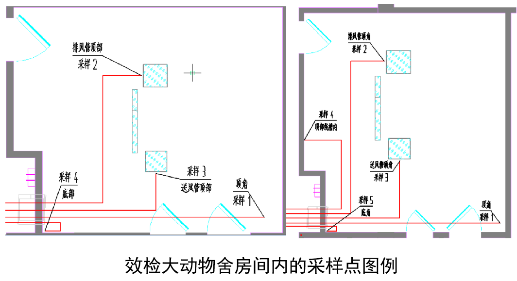 u 消毒空間:包含效檢大動物舍2間,動物出口緩沖間2間,強制淋浴室2間,防護服更換間2間 ,送風BIBO(袋進袋出高效過濾單元)8套,排風BIBO(袋進袋出高效過濾單元)6套以及該系統內所有連接的通風管道);
